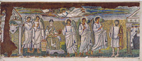 Tornando alla produzione artistica, dobbiamo rilevare che, fatta eccezione per qualche immagine tanto rara quanto discussa nei sarcofagi dell'intero orbis Christianus antiquus, l'ingresso della figura di Giuseppe nel repertorio figurativo si avvista soltanto nel pieno v secolo e, in particolare, nel maestoso scenario musivo del santuario mariano, commissionato da Papa Sisto iii (432-440), all'indomani di quel concilio di Efeso che, nel 431, sancisce il dogma del parto verginale di Maria. Ebbene, nel celebre arco trionfale della basilica che si innalza sull'Esquilino, sfilano, in una sequenza continua, gli episodi salienti dell'infantia Salvatoris, ora ispirata ai vangeli canonici, ora agli scritti apocrifi.