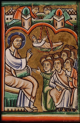 Ed ecco alcuni uomini, portando sopra un letto un paralitico, cercavano di farlo passare e metterlo davanti a lui. Non trovando da qual parte introdurlo a causa della folla, salirono sul tetto e lo calarono attraverso le tegole con il lettuccio davanti a Gesù, nel mezzo della stanza. Veduta la loro fede, disse: “Uomo, i tuoi peccati ti sono rimessi”.